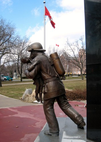 It depicts a firefighter bringing a child to safety. I really liked the movement of the sculpture — you can almost see him in action. There are also granite walls near the sculpture with the names of 531 Ontario firefighters who died in the line of duty or from an occupational disease. Two months after I was there, someone defaced the granite walls with graffiti. After a very expensive renovation that required replacing three quarters of the slabs, the new memorial was unveiled in October 2009.