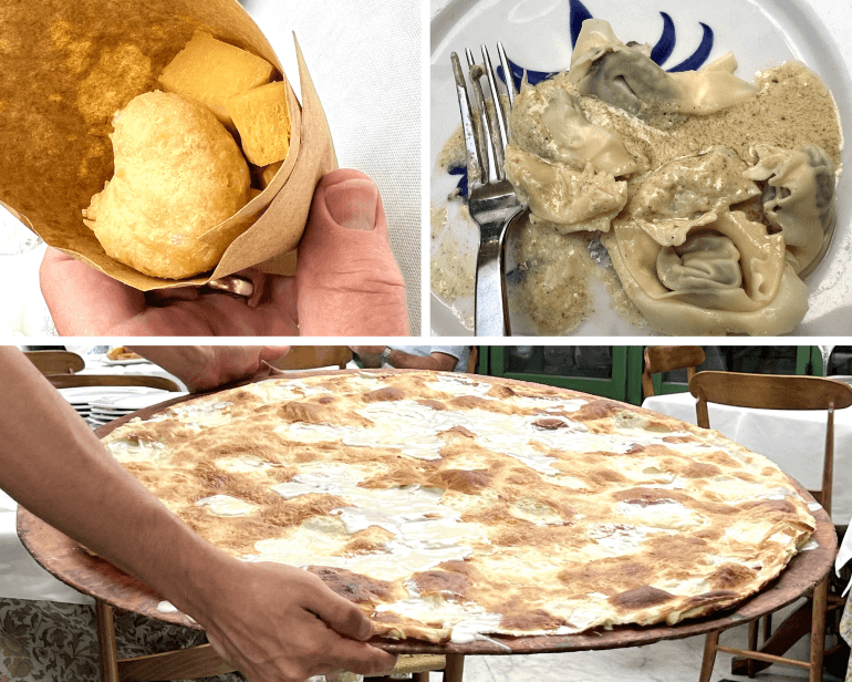 Sweet and savory delights of Liguria – brioches, fresh pasta, panissa, sardines, Genoese focaccia, pesto lasagna, and candies in the center