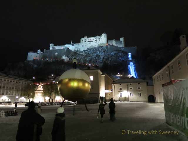 Just to the left of the sphere is a fountain, both a watering hole and a horse wash, the less famous of the two working horse washes in Salzburg. The other is in Mirabell Gardens. You can see the small monument on the back side of the fountain. Also notable about Kapitelplatz is that just below the globe and away from the fortress is a giant chessboard on the pavement, covered with snow when we were there, but populated in warmer seasons with large chess pieces about 1 meter in height, used for actual chess matches where contestants lug the large chessmen to make their moves. Imagine how that adds to the eclectic nature of the view.