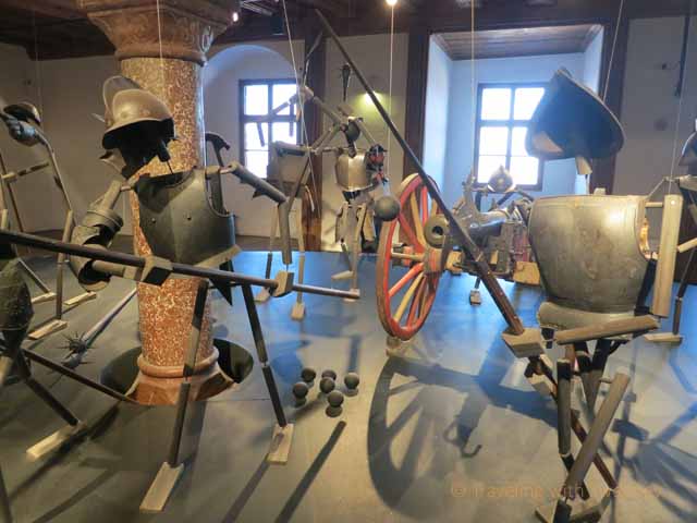 The tour continued inside the castle with a self-paced audio guide. It provided a good description as we walked through numerous rooms on several levels, including the Golden Hall, Golden Room and King’s bedchamber. I thought that the presentation of armor and weapons was nicely done. There was a similar room with display cases of medieval instruments.