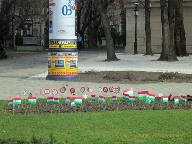 We saw preparations for this Hungarian national holiday, including school children placing small Hungarian flags (shown below) at key locations like the Hungarian National Museum . The National Museum, pictured at the top, was among the most notable sites of the mass demonstrations in Buda and Pest (the cities separated by the Danube that joined to form Budapest in 1873) that marked the “bloodless revolution” on March 15, 1848. The revolution led to the concession to demands (the 12 points of the revolution, which included an independent Hungarian government, army and bank as well as civil and religious equality) by the representatives of Austrian emperor Ferdinand I. The revolution was overthrown the following year when Emperor Franz Josef asked for help from the Russian Tsar Nicholas I, who marched Russian troops into Hungary, ending the revolution. However, the passive resistance of Hungary following the revolution led to an elevation of Hungary among Austrian nations and the formation of the Austro-Hungarian Empire in 1867. The Hungarian revolution led many other revolutions in 1848, including those in other Austrian-ruled countries and around the world.