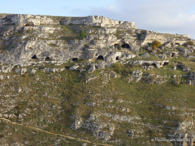 Along our walk, there were many sweeping vistas of cave dwellings and churches on either side beneath the plateau above the deep ravine carved by the Gravina River, which today is a mere trickle.