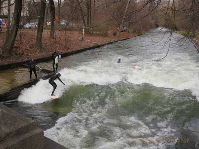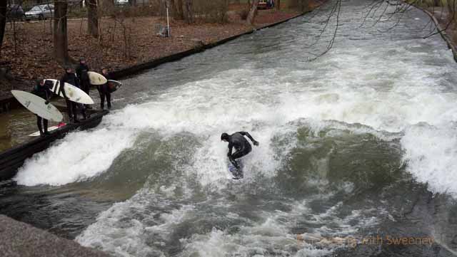 Ah, the Eisbach! I go here sometimes to watch. I would never do it. Too cold. It’s not called Eisbach for nothing!