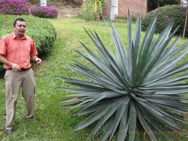 The tour was brief but fun and informative. It turns out that there’s a lot about tequila I didn’t know. For example, I thought it ws made from cactus, but the source is typically blue agave shown in the picture below. They are cultivated from 5 to 10 years and determining harvest readiness is an art. Harvesting too soon or too late renders the agave useless for tequila. The window of readiness is only about a month, so each plant is checked monthly. The blue agave requires regular trimming and the small plants that grow from each plant need to be removed (often replanted elsewhere).