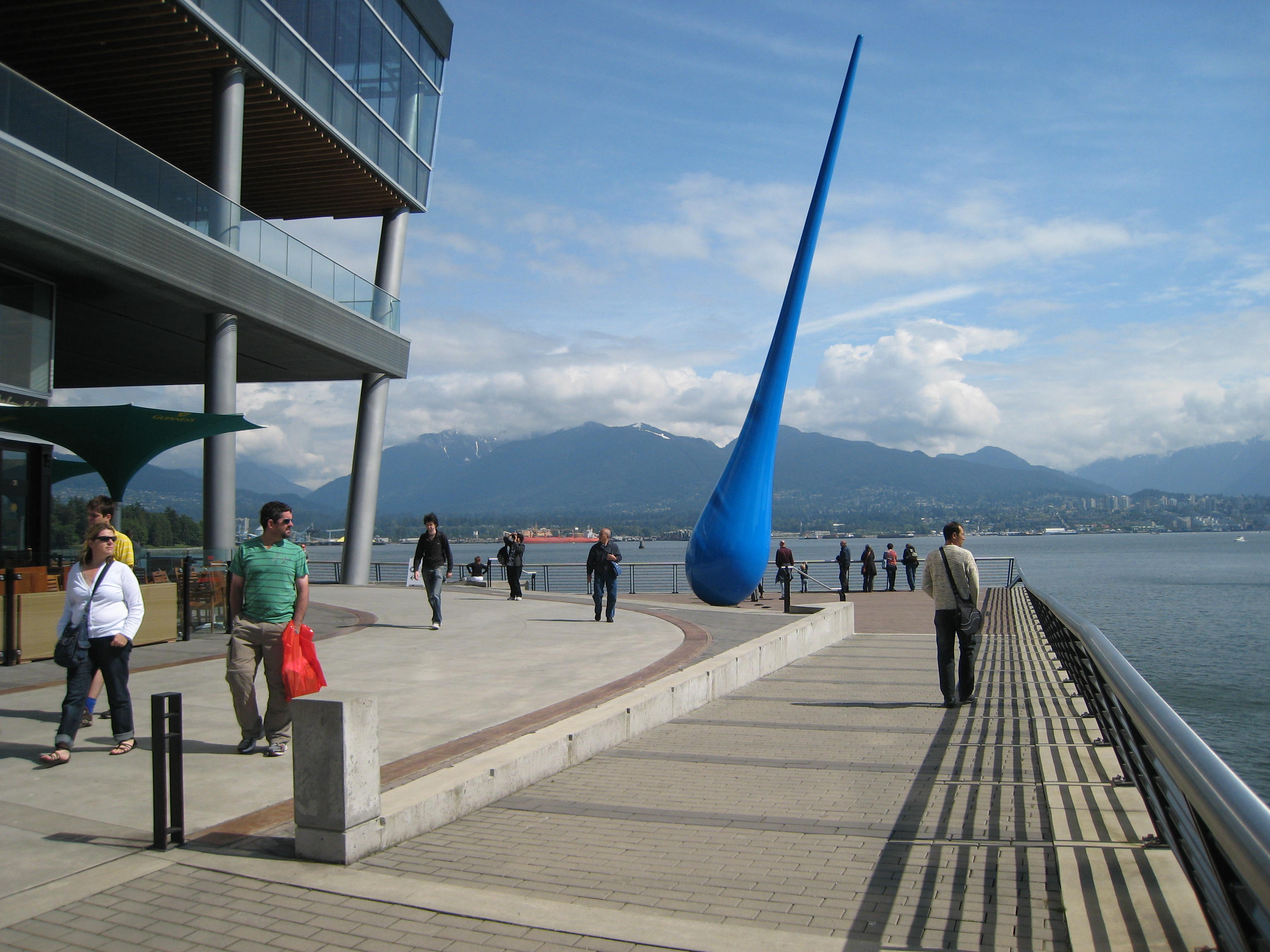 Shown in this photo is The Drop, a 65 ft tall sculpture located outside of the convention centre overlooking the water. It was created by Inges Idee, a group of German artists and installed in 2009. The Drop represents a droplet of water or rain and is an “homage to the power of nature”, as described by the artists. I think it’s beautiful in color, simplicity and placement on the edge of the seawall.